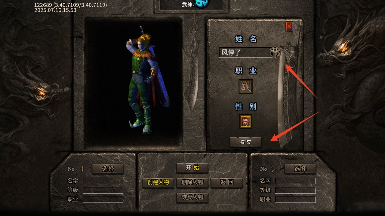 1、进入游戏后,首先需要创建角色,点击骰子按钮生成随机角色名,确认无误后点击提交,即可进入游戏。