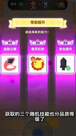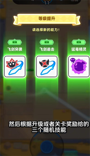 2、然后根据升级或者关卡奖励给的三个随机技能,选择一个不断的变强。