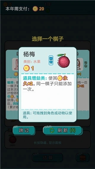 20年后,潜质卡每五年需要刷新一次,所以每隔五年要使用刷新道具去寻找潜质萝卜和饲养员。即便没有饲养员,游戏也能正常进行。需要注意的是,不要选择高品质水果天赋,这个天赋会消耗萝卜。