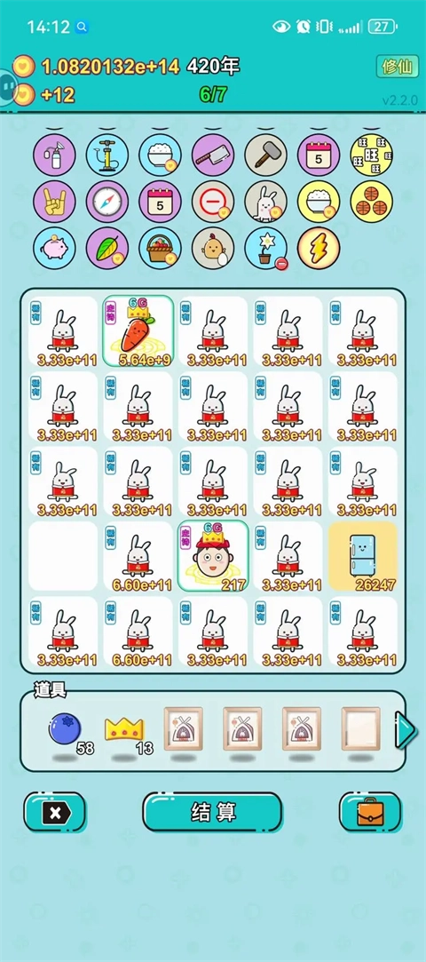 注意:理想情况下每次结算时萝卜都能吸附六个,偶尔或许会吸不满;要是兔子没有繁殖,就删掉几只兔子留出一些空位。