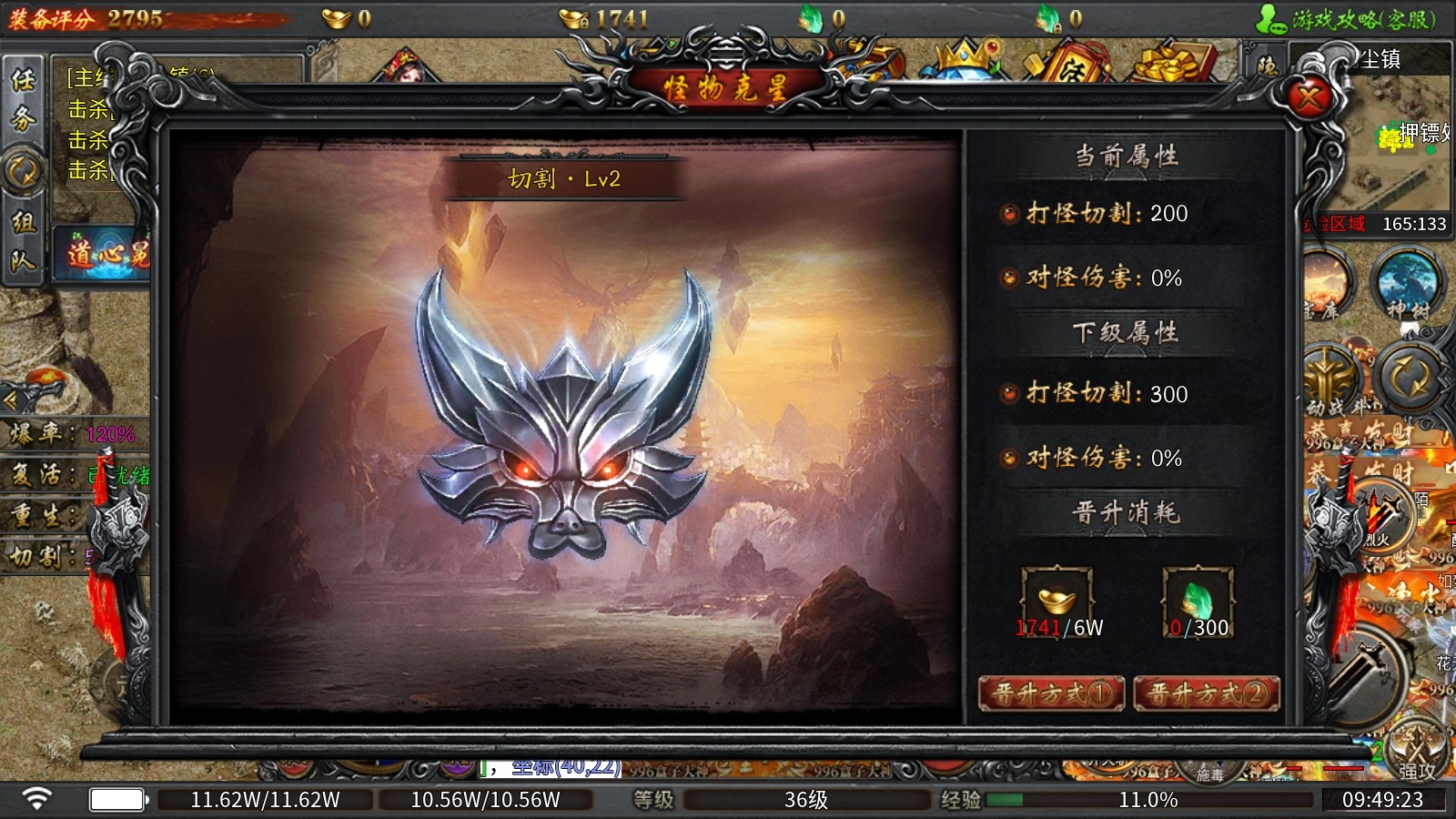 3、怪物克星:升级需消耗元宝或灵石,每提升一级都能增加切割伤害,等级达到特定阶段后,还可额外获得对怪物的伤害加成。