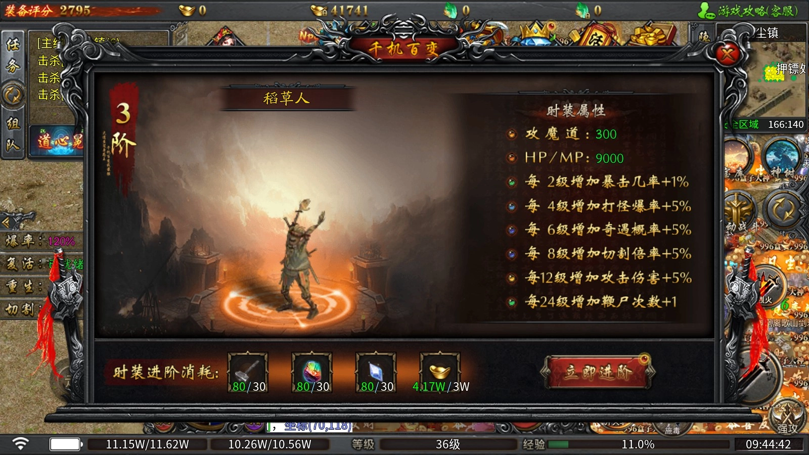 1、千机百变:通过消耗天工锤、元素石、装备结晶与元宝来完成进阶,每提升一阶都能带来可观的攻魔道属性加成与血量增长,同时还会依据等级差异解锁各类强力BUFF。