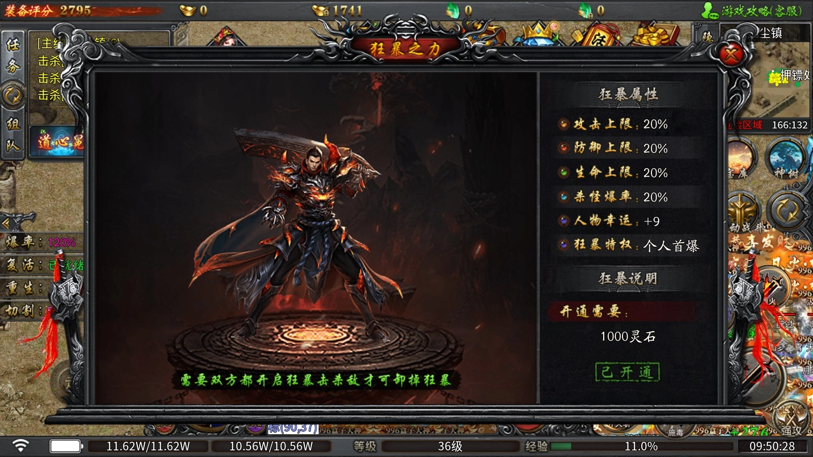 4、狂暴之力:消耗灵石就能开启,开启后可获得攻击、杀怪爆率、人物幸运等属性加成,且只有当双方都处于狂暴状态时,互相击杀才能解除对方的狂暴效果。