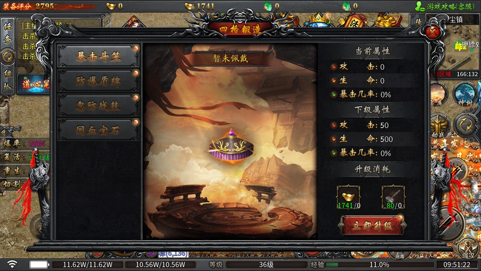 5、四格锻造玩法:消耗元宝与天工锤,就能打造出暴击斗笠、防爆盾牌、忽防战鼓以及回血宝石这些道具。