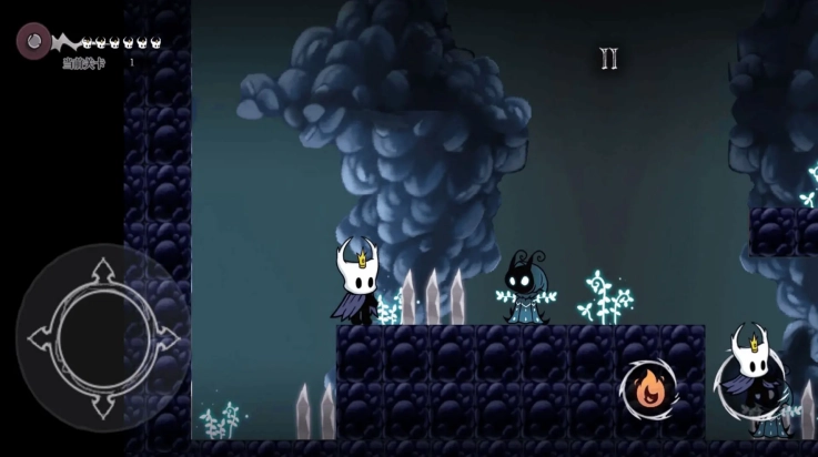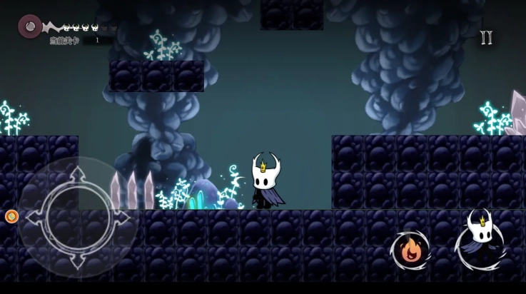1、通过左右移动和跳跃操作控制小小骑士,跨越悬崖、台阶等各类障碍,同时避开潜藏在悬崖下方的敌人。