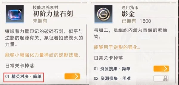 初阶力量石刻和影金的获取途径如下图: