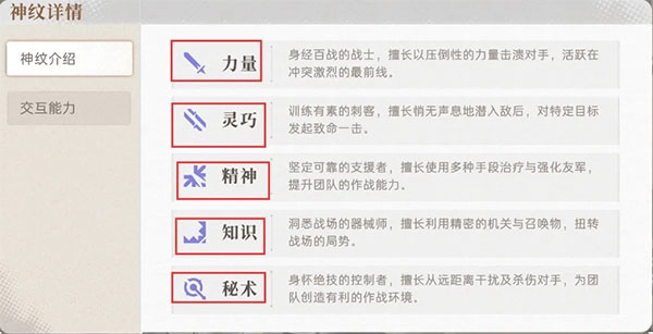 在《逆光潜入》里,每个角色身上都带有神纹,这些神纹其实就是角色的属性。游戏里的神纹包含了下图展示的几种,就目前而言,逆光的神纹主要有五种,分别是力量、灵巧、精神、知识和秘术。每种神纹都有着与之对应的特征,具体内容可参考下图。
