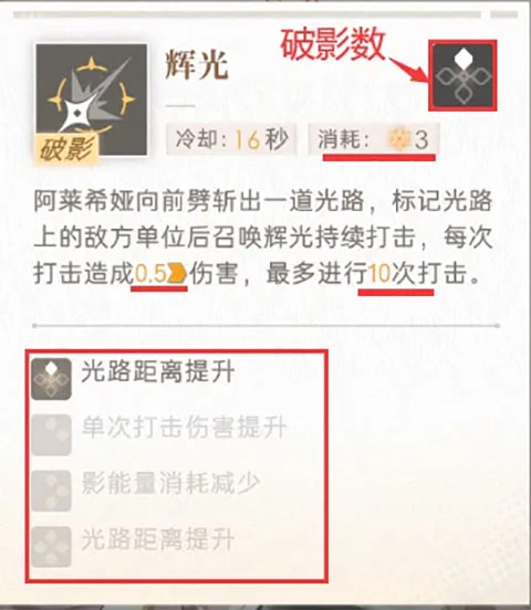 游戏里的技能其实就是我们常说的大招,角色处于潜行状态时,大招的释放得有足够的影能量作为支撑才行。主技能的强化主要依赖破影的提升,破影数是通过重复获取角色来增加的,每提升一个破影数,主技能都会得到对应的增强。