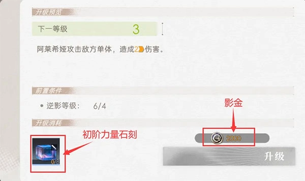 普攻也就是大家常说的平A,每个角色的普攻伤害存在差异,比如图中的角色阿莱希娅,她的普攻伤害数值为1,而雪濑的普攻伤害则是0.5。若要提升普攻伤害,需要用到初阶力量石刻与影金这两种材料,每提升一个等级,普攻伤害都会有所增长。