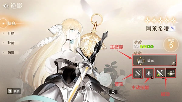 每个角色都具备一个主技能、普攻、一个主动技能以及两个被动技能,拿我方老婆阿莱希娅来举例,具体情况如下图所示: