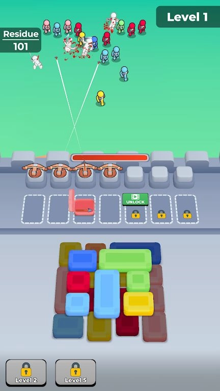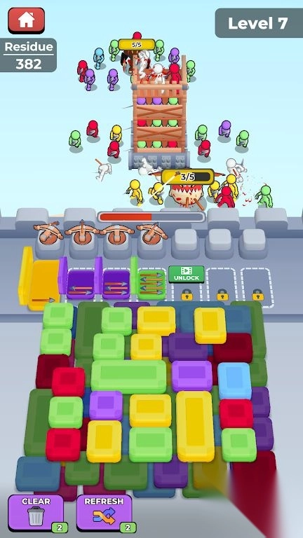 1. 屏幕下方是可消除的方块矩阵,上方则是敌人的行进路线。玩家需要分屏兼顾两部分——通过消除方块来积累能量,再及时点击释放箭矢。