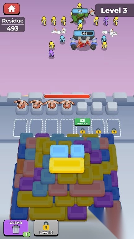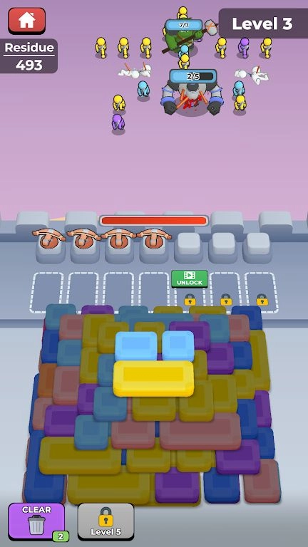 3.城堡与敌人的造型设计简洁而鲜明,通过明快的色彩来清晰区分敌我双方。当消除方块时,会触发粒子特效,以此增强战斗过程中的爽快感。