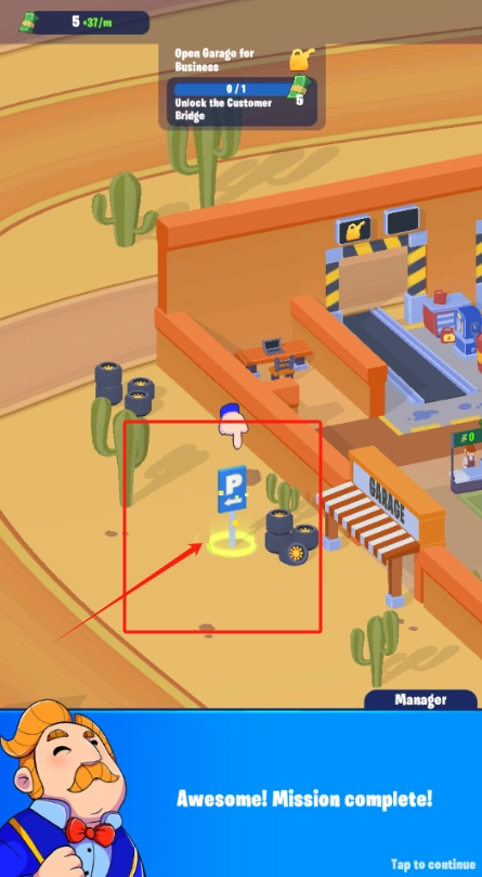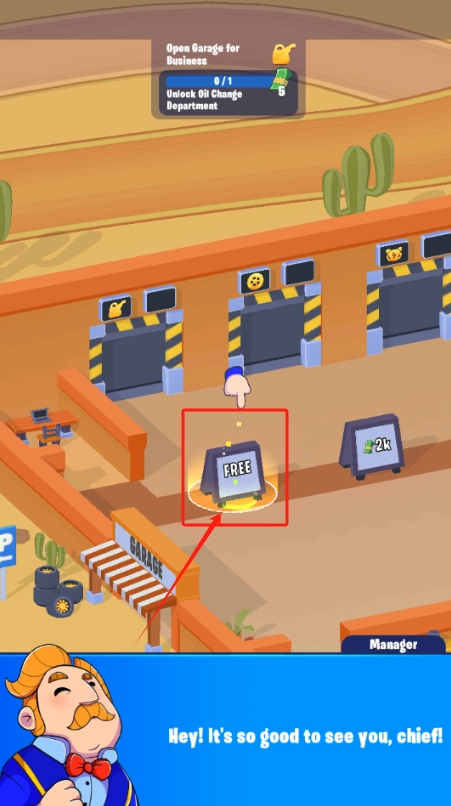 1、点击红框内的免费按钮,即可开启你的沙漠汽修店经营之旅。