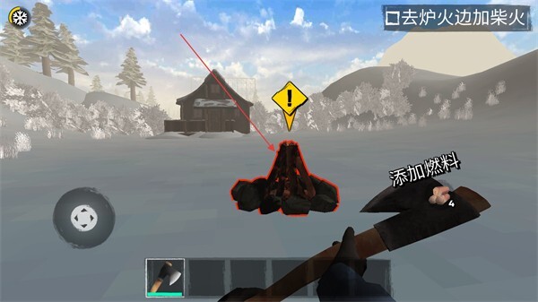 4、带着木材走到炉火旁,点击【添加燃料】按钮,往炉火里加柴来保持生存必需的温度。
