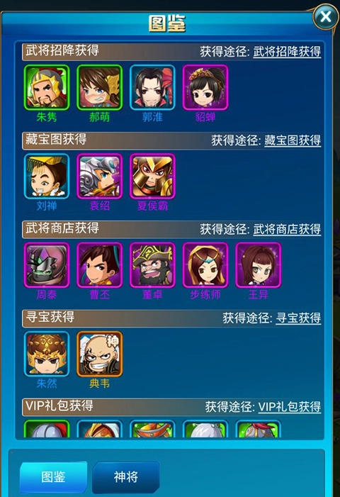2、玩家能够借助武将图鉴了解武将的获取途径及其属性特点。