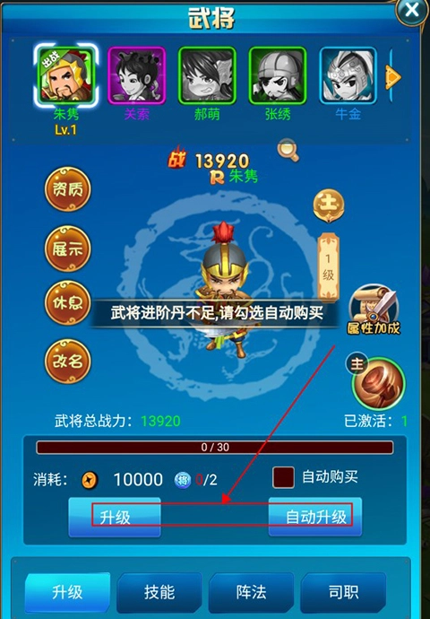 3、玩家在获得武将后,可安排其出战,还能对武将进行升级和进阶操作。升级过程中需要消耗武将进阶丹,玩家可前往活动页面领取该道具。