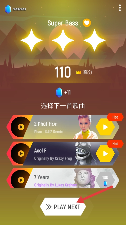 4、完成歌曲关卡后,点击【PLAY-NEXT】按钮,即可继续挑战下一首歌曲。