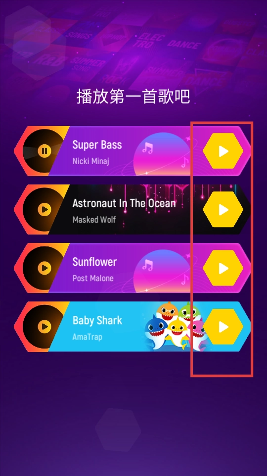 1、挑选你想播放的歌曲,点击歌曲右边那个黄色的播放按钮,就能开启游戏啦。
