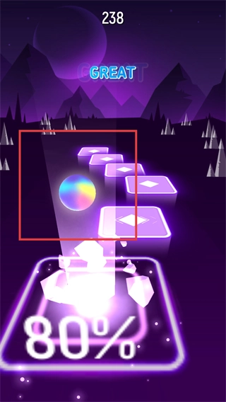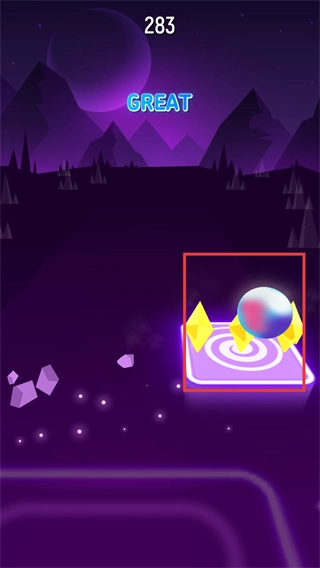 1、操控彩色球体沿着紫色方块构成的路径移动,注意避开障碍物并维持前进进度,触发GREAT判定能够提高关卡的完成效率。