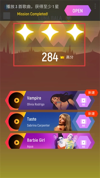 完成关卡后挑选合适的歌曲,通过积累高分来解锁三星评价,借助任务获取更多游戏奖励与权限。