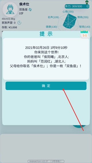 3、在阅读提示中的角色初始信息(涵盖父母信息、姓名等内容)后,点击确定按钮关闭该提示,以继续推进人生模拟的进程。