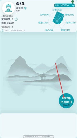 4、在角色信息界面,点击2022年01月01日对应的下一年按钮来推进时间,在此过程中还能查看角色各项属性随时间发生的变化。