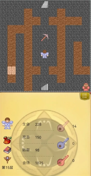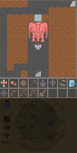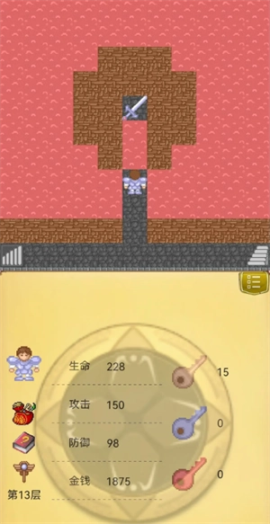3、玩家要想通关,就得考虑打怪的先后顺序、钥匙的使用时机等问题。这款游戏操作起来不算难,可对玩家策略能力的要求却很高。还有些道具是隐藏着的,举个例子,玩家被关起来后出来找剑,会看到剑放在一个没门的房间里,但实际上周围的墙壁中藏着一道暗门。