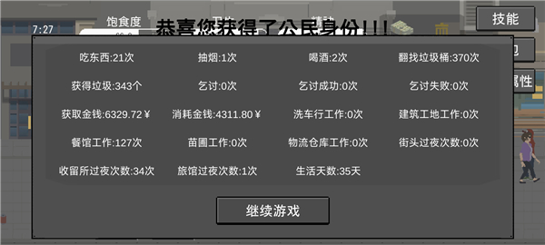 开局别去乞讨,技能都点和捡垃圾有关的,吃饭就去餐馆,钱不够的话可以在餐馆打几次工来补贴家用。