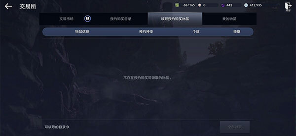 通过预约购买方式成功购得的道具,可在交易所上方的[领取预约购买物品]处领取。