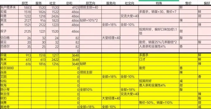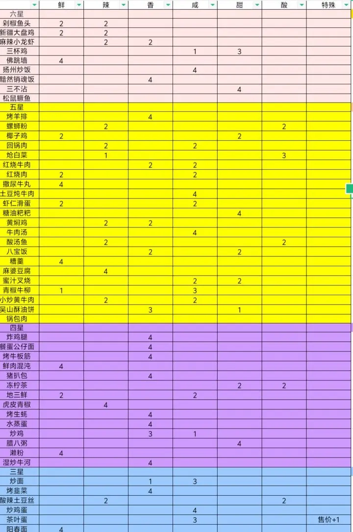 游戏里包含各式各样的食谱,每个角色都有自己擅长的领域,下面就为大家总结一下: