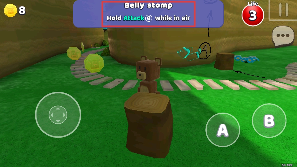 在空中时按住B键,执行腹部踩踏动作,以此完成互动或攻击操作。