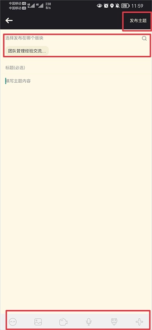 2、接着在编辑界面里搜索你要发布内容对应的版块,选好版块后,把要发布的内容、标题等编辑妥当,再点击右上角的“发布主题”按钮就可以了。