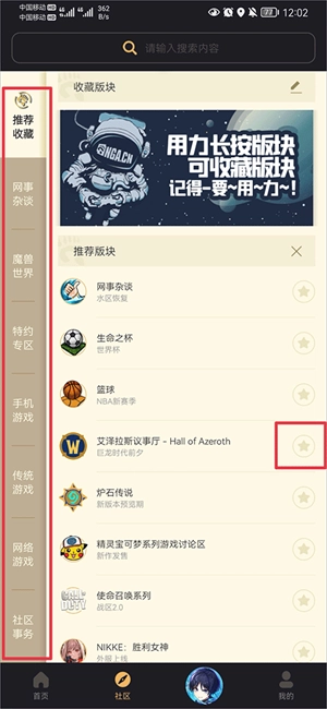 1、在社区界面里挑选你喜欢的版块,点击版块右侧的星星图标就能完成对该版块的收藏操作