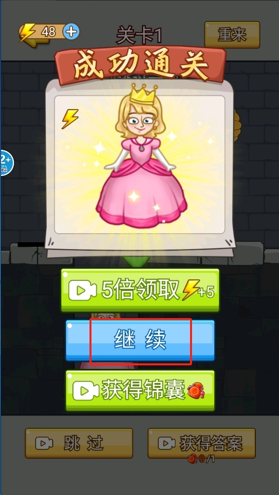 4、点击继续以领取奖励并进入下一关。