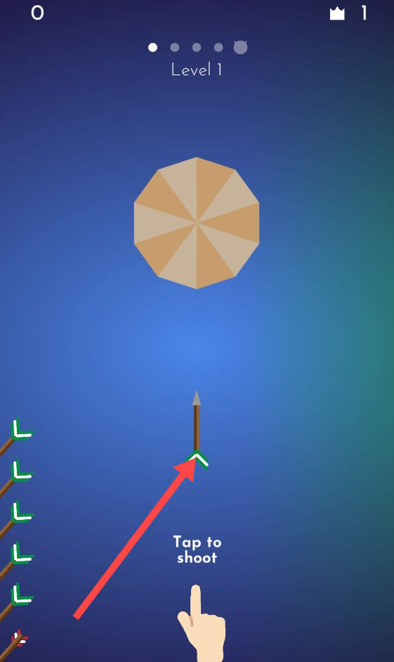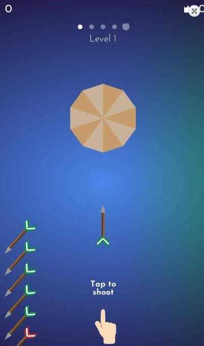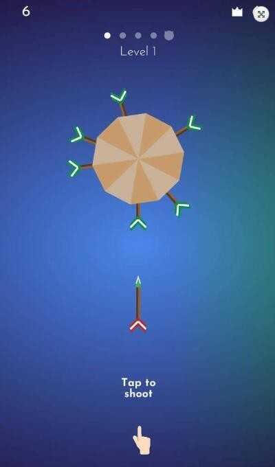 1、触屏投射箭头:点击屏幕向旋转圆盘发射箭头,避开已有箭矢与障碍物,插入空隙累积分数。