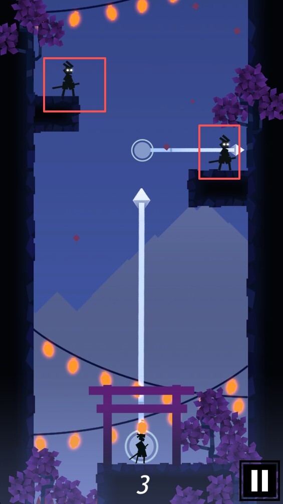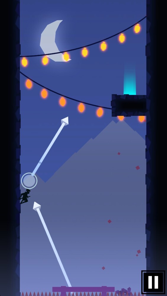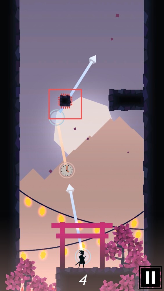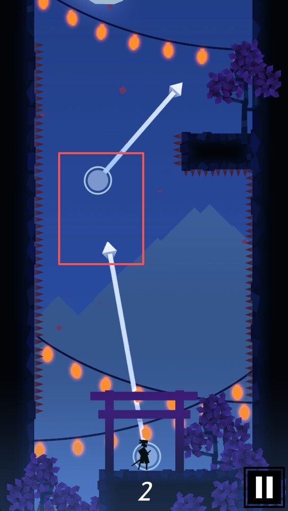 4.点击并滑动屏幕,操控你的忍者进行跳跃。只要不落到带尖刺的区域,忍者就能一直附着在当前位置,直到你再次进行移动操作。
