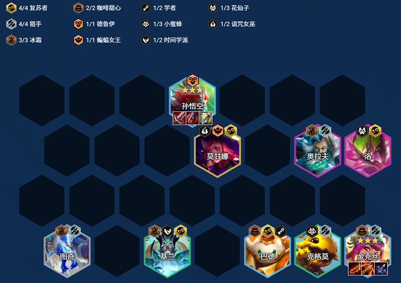 ● 在搭配4复苏羁绊的超高续航能力,来提升悟空的坦度与生存能力,悟空在3星后简直就是一个不可逾越的城墙,可谓“一夫当关万夫莫开”。