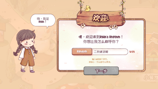 下载打开瑞亚斯的韵律最新版,初次进行游戏,玩家首先需要为自己输入一个专属名称,确认无误后点击下一步继续