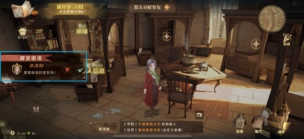 点击该按钮后,招募室友的信息将自动发布至【学院】频道,其他玩家点击此信息,你就能随机匹配到室友;同样地,你也可以在学院频道里主动加入其他玩家创建的寝室。