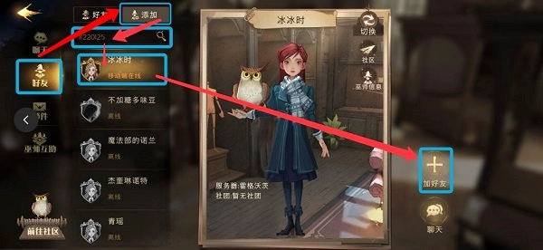 点击【猫头鹰】图标 → 选择左侧菜单栏中的【好友】选项 → 点击页面中的【添加】按钮 → 输入要添加对象的【好友昵称】,或者输入格式为【# + 编号】的内容