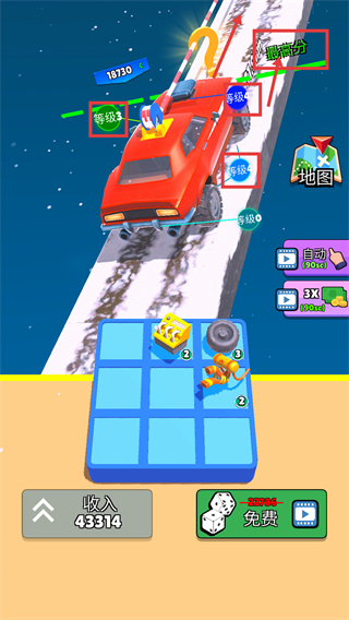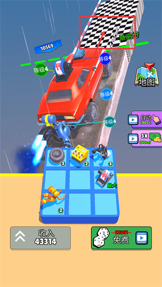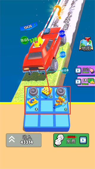 2、借助免费骰子获取2-3级的部件,完成装配后车辆部分模块会提升到相应等级,此时积分达到13626,收入也随之增长至43314。