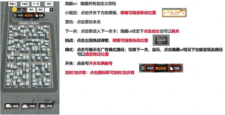 下一关:点击进入下一关卡;隐藏UI状态下点击此处同样能实现跳关操作。