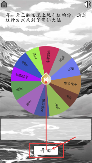 2、进入模式后点击【开始】转动转盘,随机获取穿越方式,这是踏入修仙大陆的初始流程。