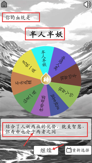 4、当抽到【半人半妖】血统后,可借助该血统兼具人、妖两族的优势来发展,点击【继续】即可推进后续的角色养成流程。