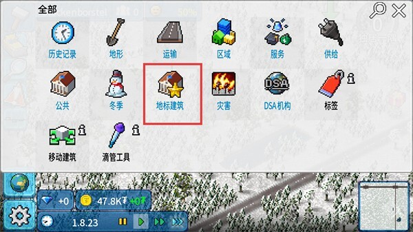 1、进入功能菜单后找到并点击【地标建筑】选项,开启地标类建筑的选择界面,为城市增添特色建筑做准备。
