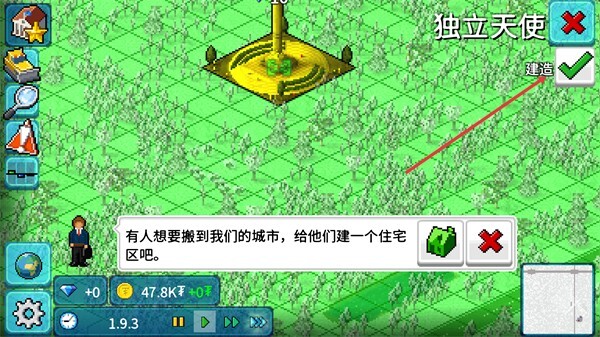 4、点击界面右上角的确认按钮完成【独立天使】的建造,同时可处理下方居民住宅的建造提示来完善城市。