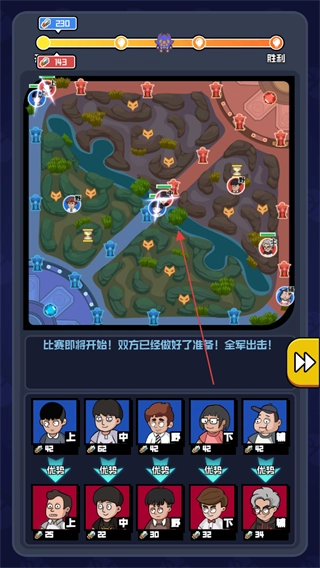 3、在赛事地图里指挥队伍行进,和对手队伍进行交锋,逐步积累对战优势。