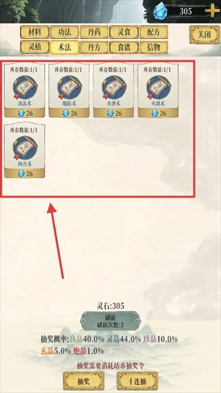2、在坊市的【术法】栏目中,能够消耗【26】钻石来购买【冰冻术】、【地陷术】、【水弹术】、【火球术】以及【风刃术】,通过学习这些术法可以增强自身的战力。