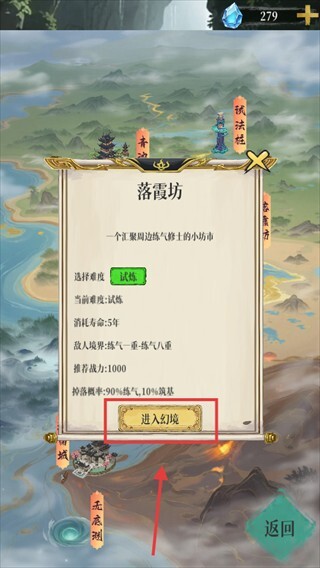 3、落霞坊幻境的【试炼】难度,需消耗5年寿命,推荐战力为1000,点击进入该幻境可获取【练气】至【筑基】阶段的资源以提升境界。