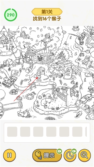 2、进入第1关的16只猴子收集界面后,在场景画面里搜寻猴子的形象,点击找到的猴子就能完成这一目标的收集。
